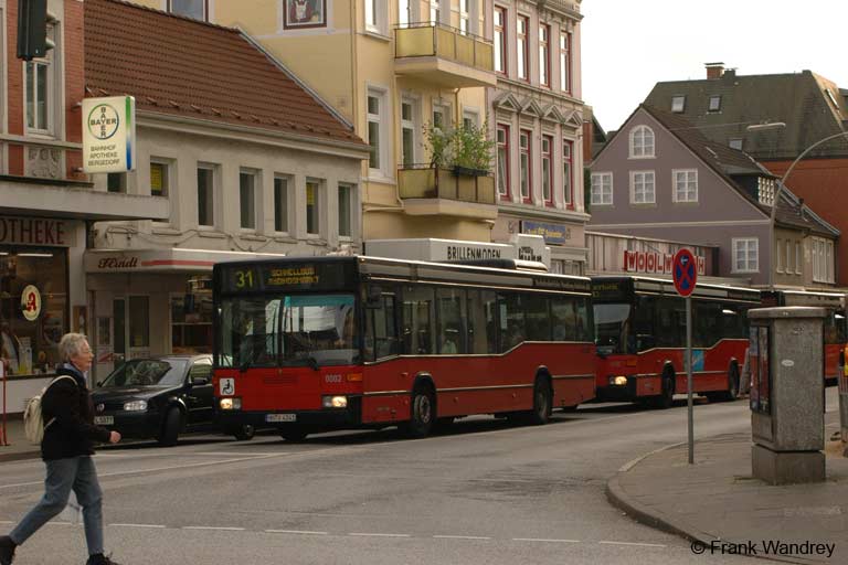 Zwischen dem Bergedorfer Bahnhof und der Haltestelle Eisenbahnbrücke zwängen sich mehrere Buslinien durch den Weidenbaumsweg in der Bergedorfer Altstadt. Die Line 31 (ganz vorne) ist bei den Verkehrbetrieben Hamburg-Holstein (VHH) die Schnellbuslinie die zwischen Geesthacht und Rödingsmarkt verkehrt.