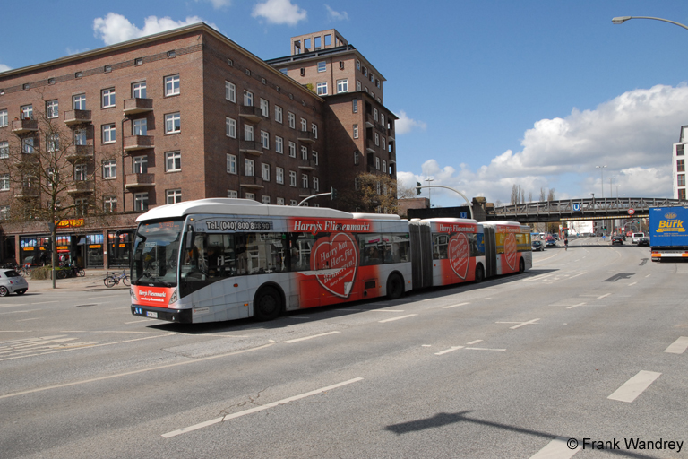 Einer von der Doppelgelenkbusflotte kurz hinter der U-Bahn-Haltestelle Hoheluftbrücke. Diese Fahrzeuge verkehren auf der Metrobuslinie 5 zwischen Hauptbahnof ZOB und Niendorf bzw. Burgwedel. Bemerkenswert ist, daß die Busse auf der alten Straßenbahntrasse verkehren.