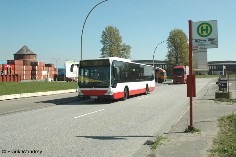 Roßweg/HDW, so heißt eine Haltestelle die im Hamburger Freihafen platziert ist. Die Großbuchstaben HDW stehen für Howaldtswerke-Deutsche Werft, die hier vor vielen Jahren mal angesiedelt war. Leider ist diese Großwerft der Werftenkrise, die mitte der 80er Jahre herschte, zum Opfer gefallen. Wo einst viele Meschen zu sehen waren die morgens zur Arbeit auf die Werft gingen, sieht man heute viele LKW´s, die auf dem ehemaligen Werftgelände ihre Ladungen abliefern und aufnehmen. Was geblieben ist, ist die Buslinie 152, die bis heute dieser Umgebung treu geblieben ist.