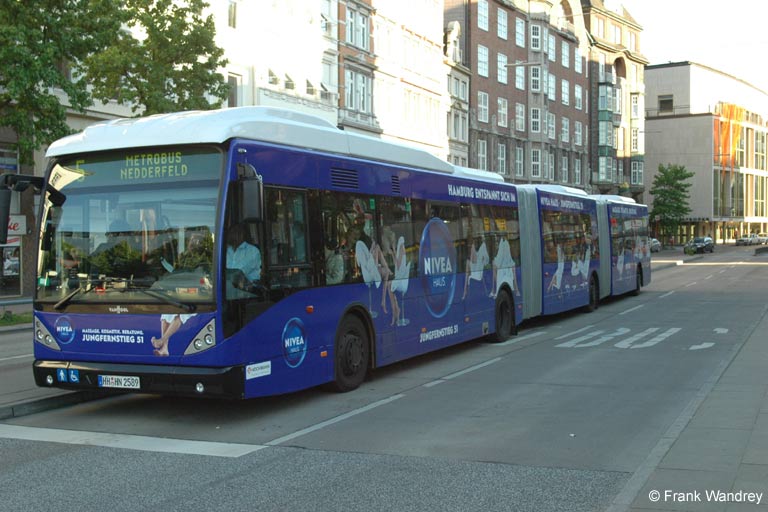 Auch am Stephansplatz unweit vom Gänsemarkt präsentiert sich am 2. Juni 2006 Wagen 8509 der XXL-Flotte in Vollflächenwerbung. Sein Fahrziel ist die Endhaltestelle Nedderfeld.