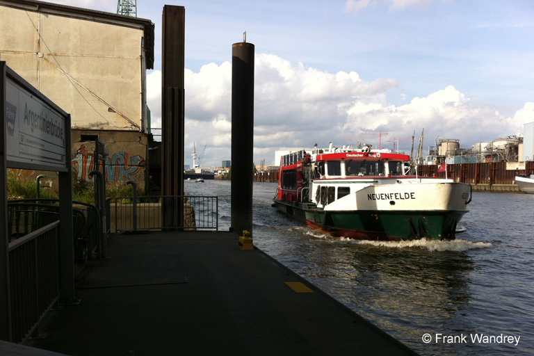 Das Fährschiff Neuenfelde fährt den Anleger Argentinienbrücke auf der Fährlinie 73 an. Hier ist auch die Endhaltestelle. Nach einem kurzen Aufenthalt geht es wieder zurück zu den St. Pauli Landungsbrücken. Die Fahrzeit beträgt je nach Gezeitenlage ca. 20 Minuten