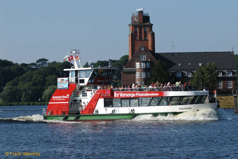 Das Fährschiff Övelgönne ist so eben in den Köhlfleethafen eingefahren und passiert die Lotsenstation. Das Schiff wird in Kürze in Finkenwerder anlegen und zu den Landungsbrücken zurück fahren.