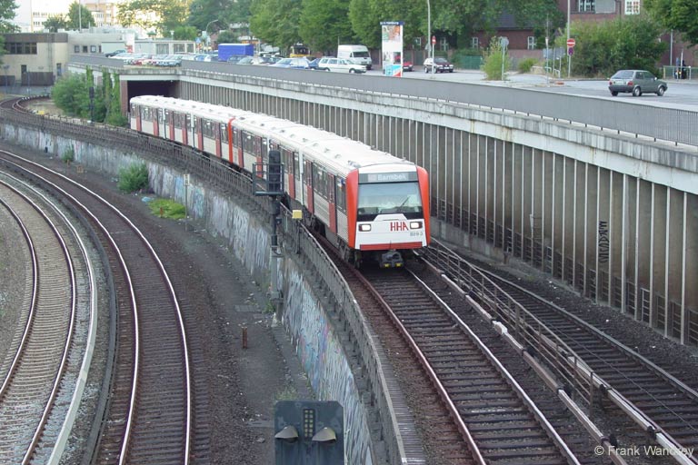 Als Line U2 verlässt der Modernisierte DT3-Zug den Bahnhof Berliner-Tor in Richtung Wandsbek-Gartenstadt. Parallel dazu verlaufen die Gleise der S-Bahn in Richtung Ohlsdorf-Poppenbüttel.