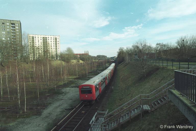 Zwischen Billstedt und Legienstraße verläuft die Strecke in einem breiten Einschnitt. Ein Zug des Typs DT2 verlässt den Haltepunkt Legienstraße und erreicht in kürze den Bahnhof Billstedt. Die DT2-Züge wurden zum Großteil ausgemustert, so das sie auf dem Streckennetz kaum noch zu sehen sind.