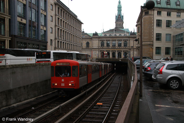 Die Tunnelausfahrt zwischen Rathaus und Rödingsmarkt und darüber die Handelskammer-Hamburg. Ein DT-3 Zug in seiner ursprünglichen Form auf der U3. Sein Fahrziel ist Barmbek.