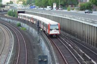 Zwischen Billstedt und Legienstraße verläuft die Strecke in einem breiten Einschnitt. Ein Zug des Typs DT2 verlässt den Haltepunkt Legienstraße und erreicht in kürze den Bahnhof Billstedt. Die DT2-Züge wurden zum Großteil ausgemustert, so das sie auf dem Streckennetz kaum noch zu sehen sind.